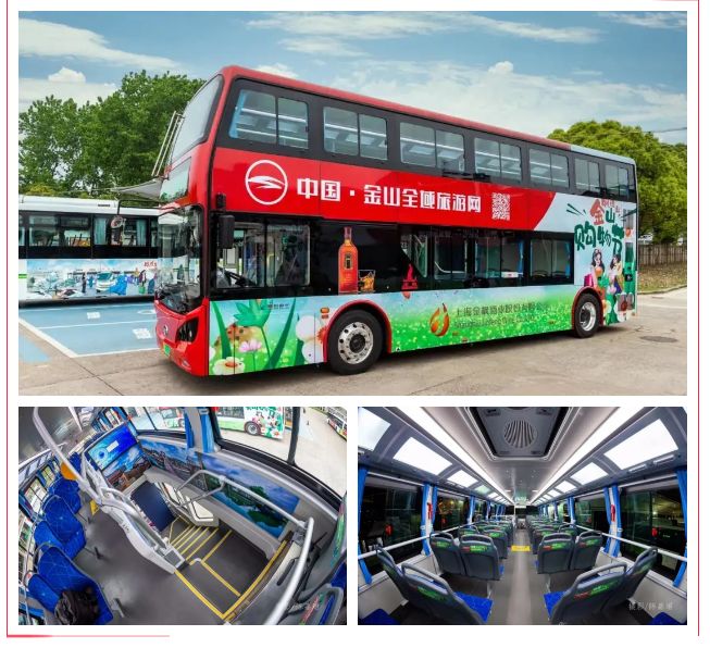双层旅游观光巴士采用的比亚迪双层城市客车,身长10.35米,宽2.55米,高4.2米,是一款纯电动新能源车。市民可通过0.7米宽的楼梯进入二层,二层高度1.75米,避免出行市民出现碰伤。全车还采用了大幅观景窗的设计,不仅保证透光性,还便利市民乘车时领略如画美景、品味金山风光。除此之外,每辆车还设有金山优选商品专区,动动手指按照提示下单购买,便可将金山特产带回家和亲人分享。